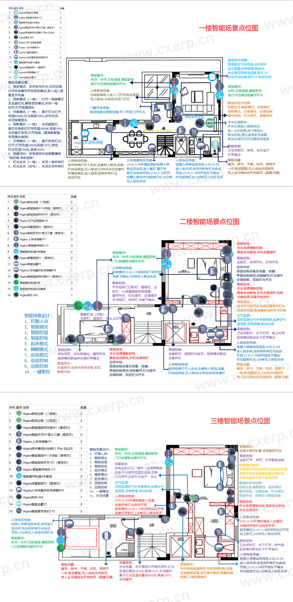 - 该图纸展示了一楼智能家居的设备布局与场景联动逻辑,涵盖以下核心场景: