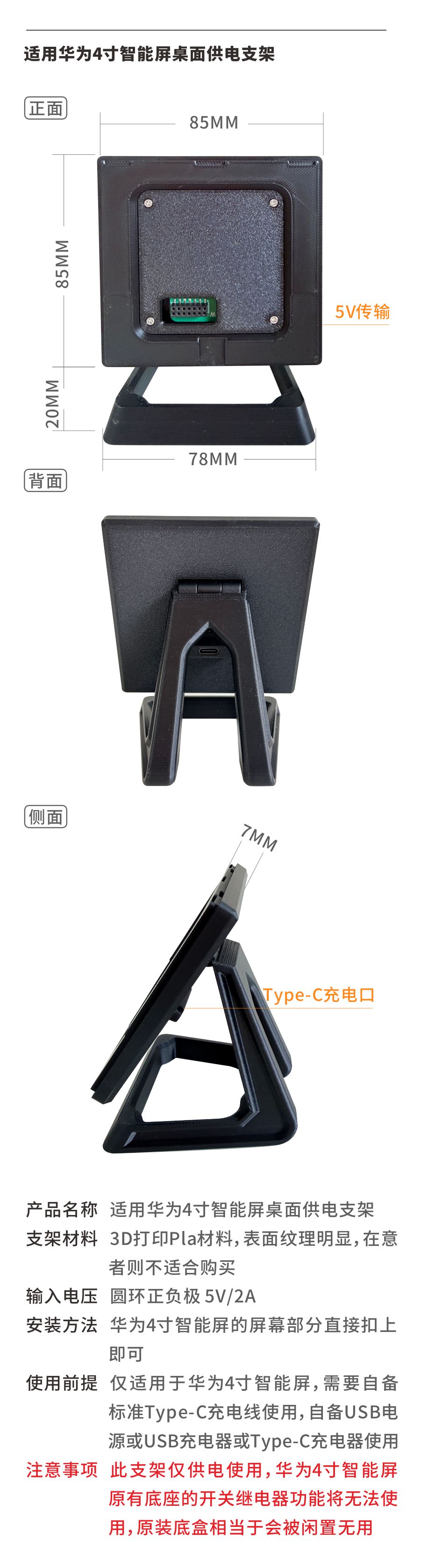 适用华为4寸智能屏桌面供电支架 不含中控屏 兼容传翔5代6代墙充