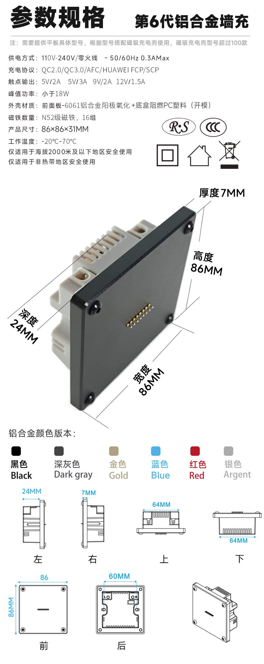 接入米家,6061铝合金阳极氧化,8触点插针式设计,18WQC3.0快充标准,平板显示快充
