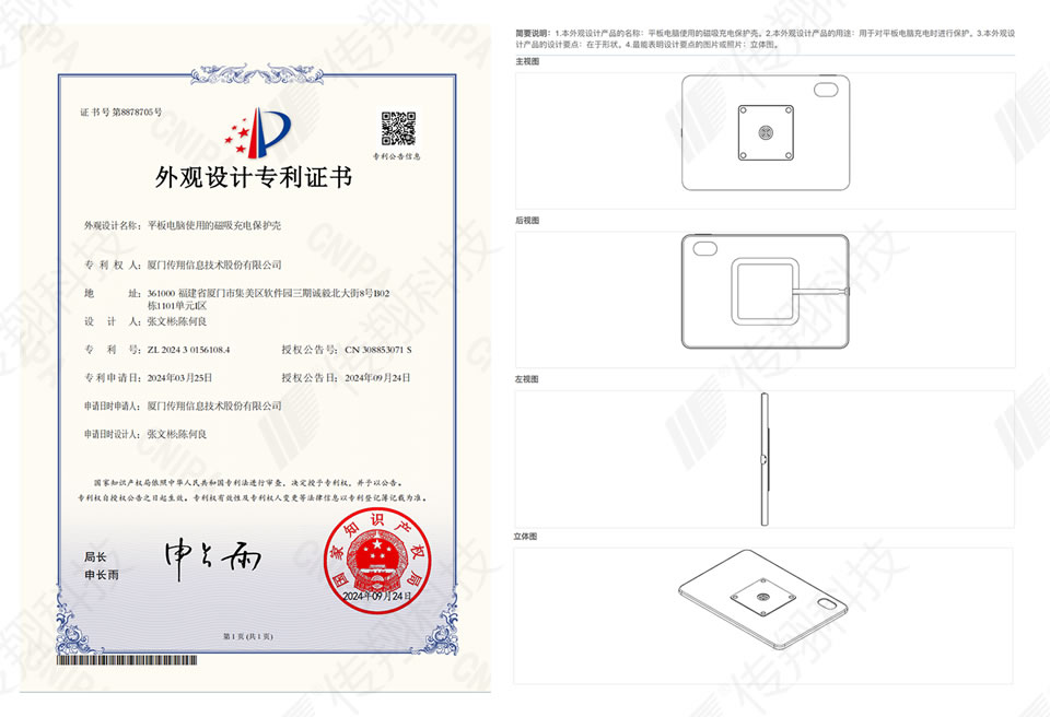 智能无线墙充的配件,安装于平板保护壳背面,要求平板充电口为TypeC接口且居中位置。