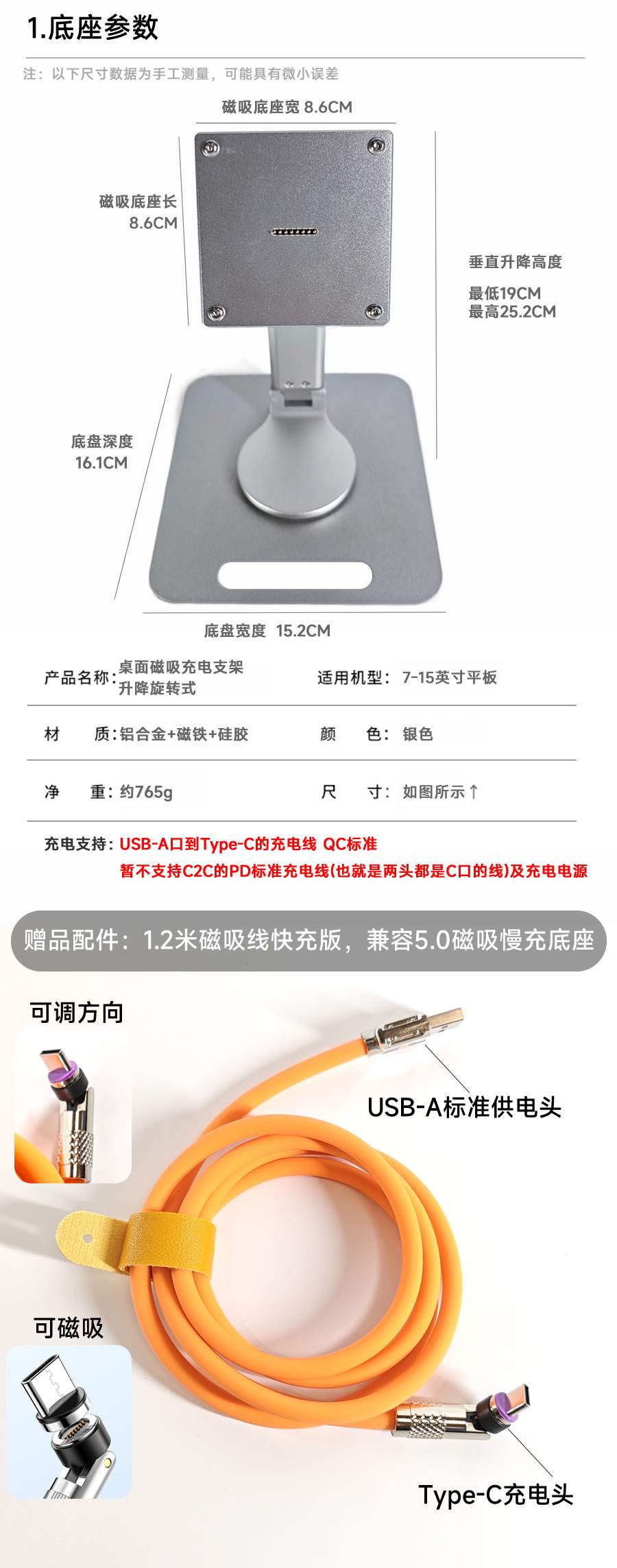 【仅底座】需配合磁吸充电壳使用 支持7-15英寸平板 快充功率18W 360° 可升降